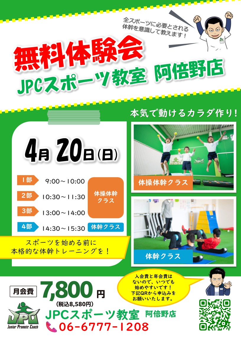 4/20(日)に『無料体験会』を開催いたします! この無料体験会では実際の授業と同じ形式(60分間)で受講することができます!   ☆詳細内容 定員:各クラス先着10名様まで 開催場所:JPCスポーツ...