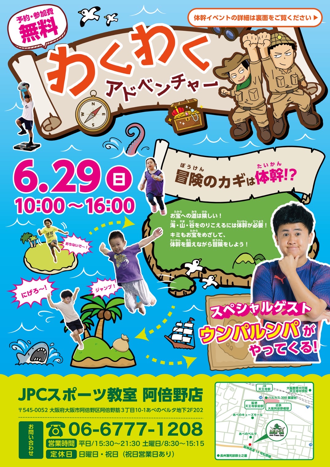 今回はあの大人気インフルエンサー「ウンパルンパ」が 6/29(日)JPCスポーツ教室阿倍野店にやって来ます! 当日は一緒にアドベンチャーパークを体験できたり体幹トレーニングの授業を一緒に受けたりするこ...