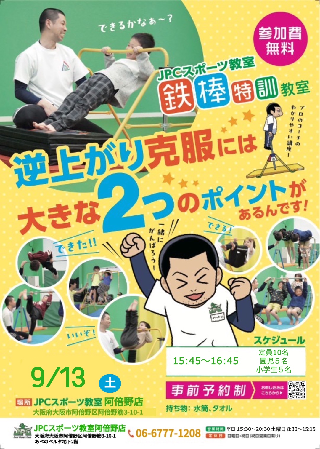 9/13(土)に鉄棒特訓教室を開催します! ◎詳細 ☆時間 15:45〜16:45 ☆場所 JPCスポーツ教室阿倍野店 ☆参加費 無料 ☆定員 先着10名(園児5名・小学生5名)   当日はあらかじめ...