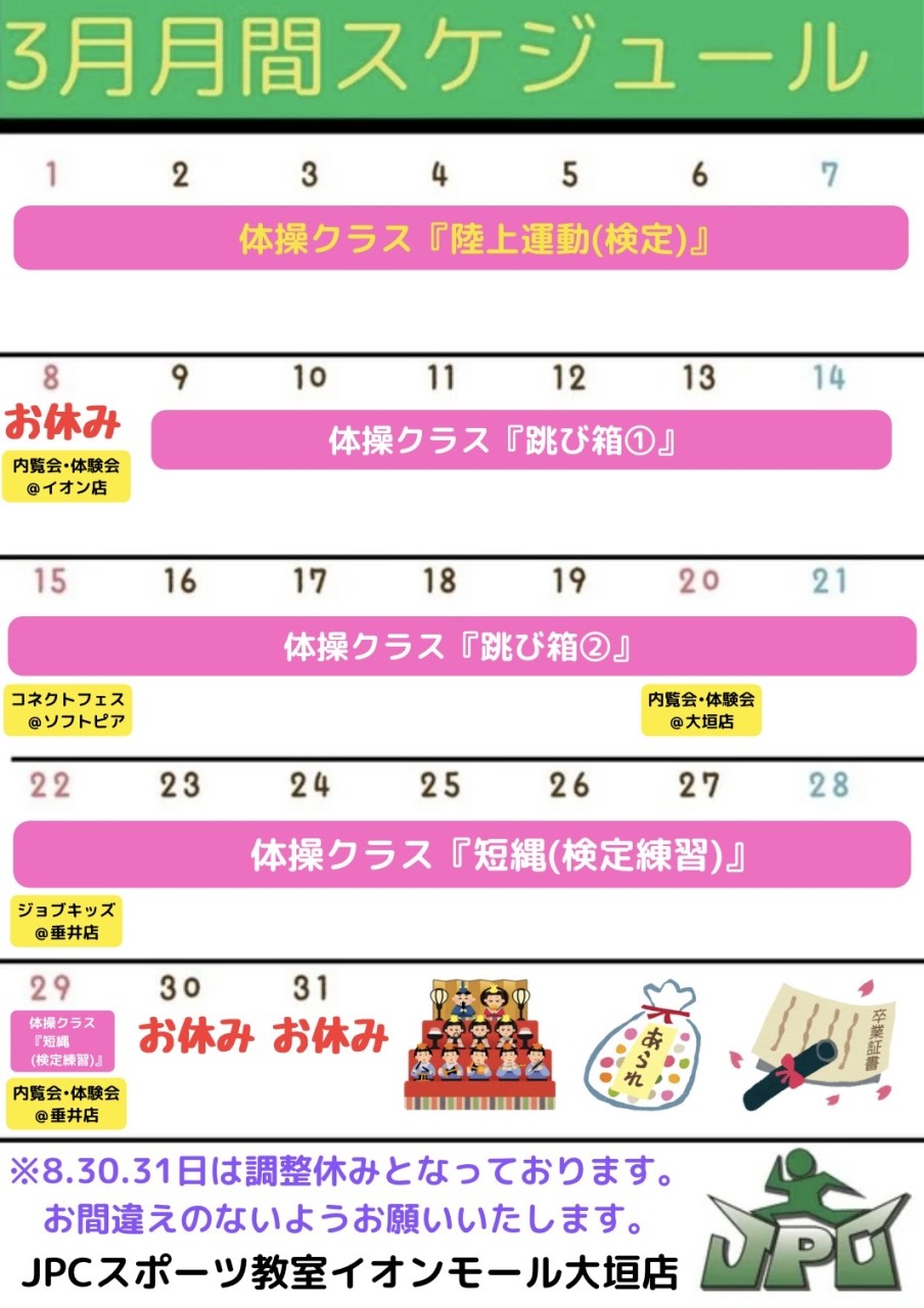 2026年の年間カレンダーと3月の月間カレンダーです。 2/8(日)、3/30(月)、3/31(火)はお休みとなります。 お間違いのないようにお願いいたします。 【3月のスケジュール】 ◇体操クラスは...
