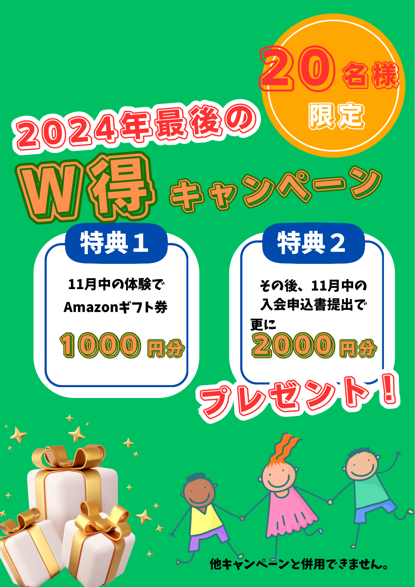 今年最後のダブルでお得なキャンペーン情報です👋 条件は下記になります! ・11月の体験申込で11月中に体験が特典1となります。 ・11月中に入会申込提出(始めるのは12月からでも可)で特典2となります...