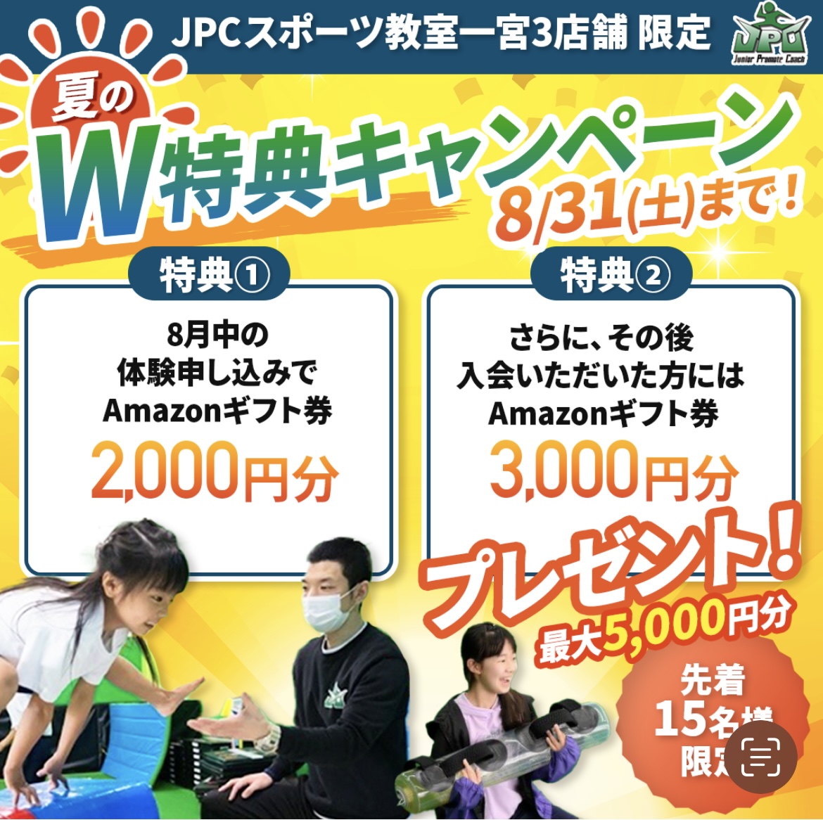 夏休み限定のお得なキャンペーン実施中🙌 8月に申込するだけで特典の対象に!!! 初めての方はもちろん。 1回体験に行ったけど、子どもがクズって充分に体験できなかった。 もう一回体験受けてみたい! とい...
