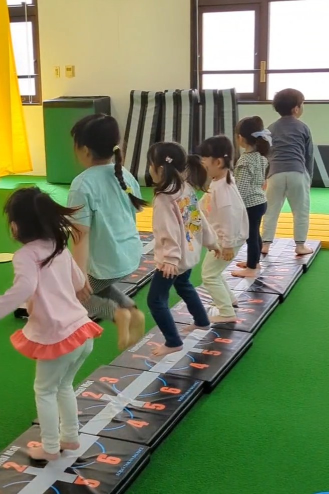 コーチが手を鳴らしたらジャンプ! 決められたマットのうえで行うことでボディコントロールだったり下半身の強化、リズム良く手を慣らすことでリズム感の向上にも繋がります お子さまの体幹づくりは厚木のスポーツ...