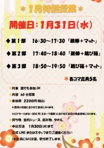 1月の特別授業についてのお知らせです📣     自分の苦手な分野の克服やあと少しでできそ うな技の練習などみっちり行います✨   少人数なので沢山練習ができたり、普段とは 違った授業を受けることができ...