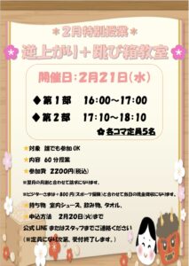 2月の特別授業は「逆上がり+跳び箱教室」を 行います✨   鉄棒や跳び箱が苦手な子、逆上がりが上がれ ない子やあともう少し子、是非ご参加くださ い🔥 もっとレベルアップしたい子もお待ちしてお りま...