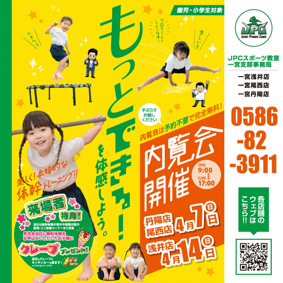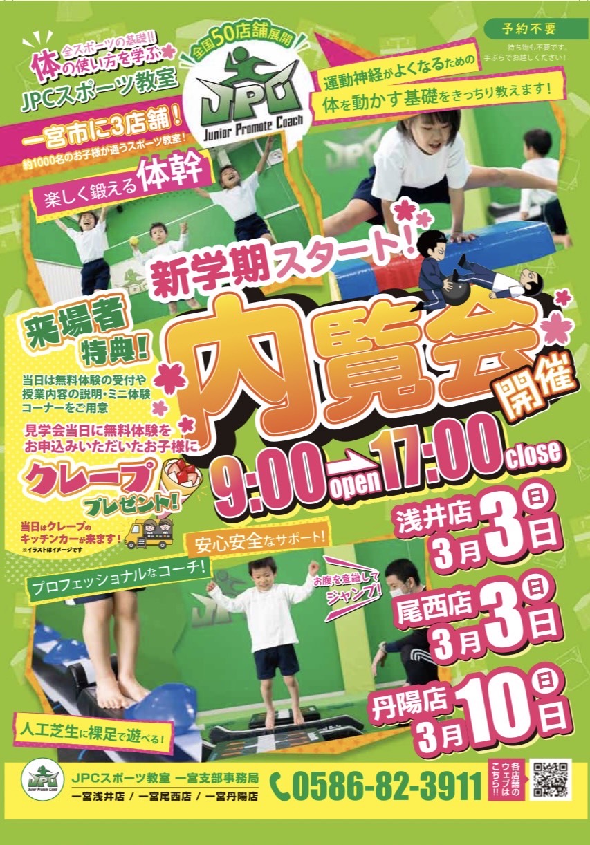 こんにちは☀️JPCスポーツ教室尾西店です!   4月7日(日) 9:00〜17:00 内覧会を開催します✨     当日は実際に店舗で跳び箱や鉄棒にも触れな がら体験できたり、JPCスポーツ教室では...
