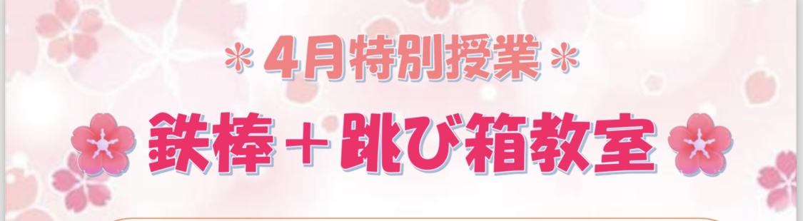 4月の特別授業は「鉄棒+跳び箱教室」 を行います✨     鉄棒と跳び箱を自分の苦手な技の克服やあと 少しでできそうな技の練習などみっちり行い ます✨ 少人数なので沢山練習ができたり、普段とは 違った...