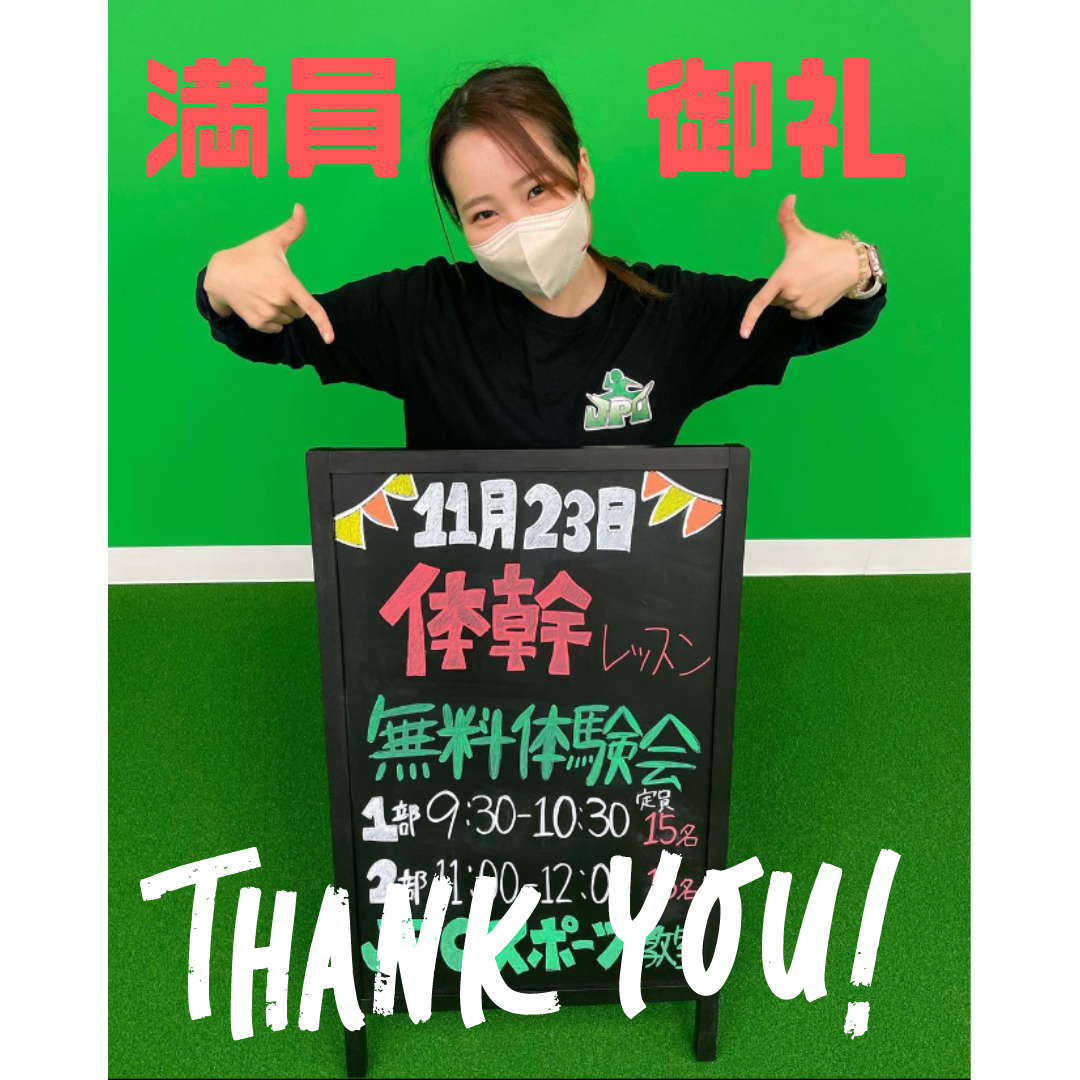 明日11/23(水・祝)の体幹レッスンの体験会ですが、大変ありがたいことに満員御礼となりました🙇‍♂️ 遊びに来てくれるお友達のみんな、コーチと一緒に楽しく体幹レッスン頑張ろう! 無料体験は通常営業日...