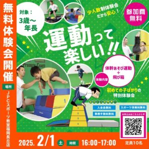1月25日(土)に体幹トレーニングクラスの無料体験会を開催します! 時 間:16時00分〜17時00分 場 所:JPCスポーツ教室長丘店 持ち物:飲み物、室内用シューズ 対 象:小学生、中学生 定 員...