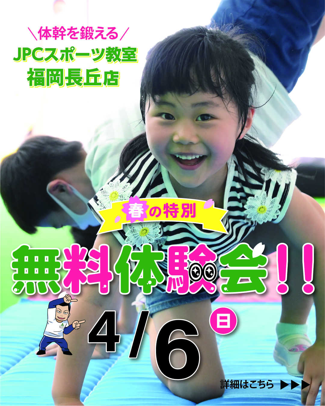 4月6日(日)に無料体験会を開催致します!   日程:4月6日(日) 場所:JPCスポーツ教室福岡長丘店 時間:〈体操体幹クラス〉    【1部】8:30〜9:30    【2部】10:00〜11:0...