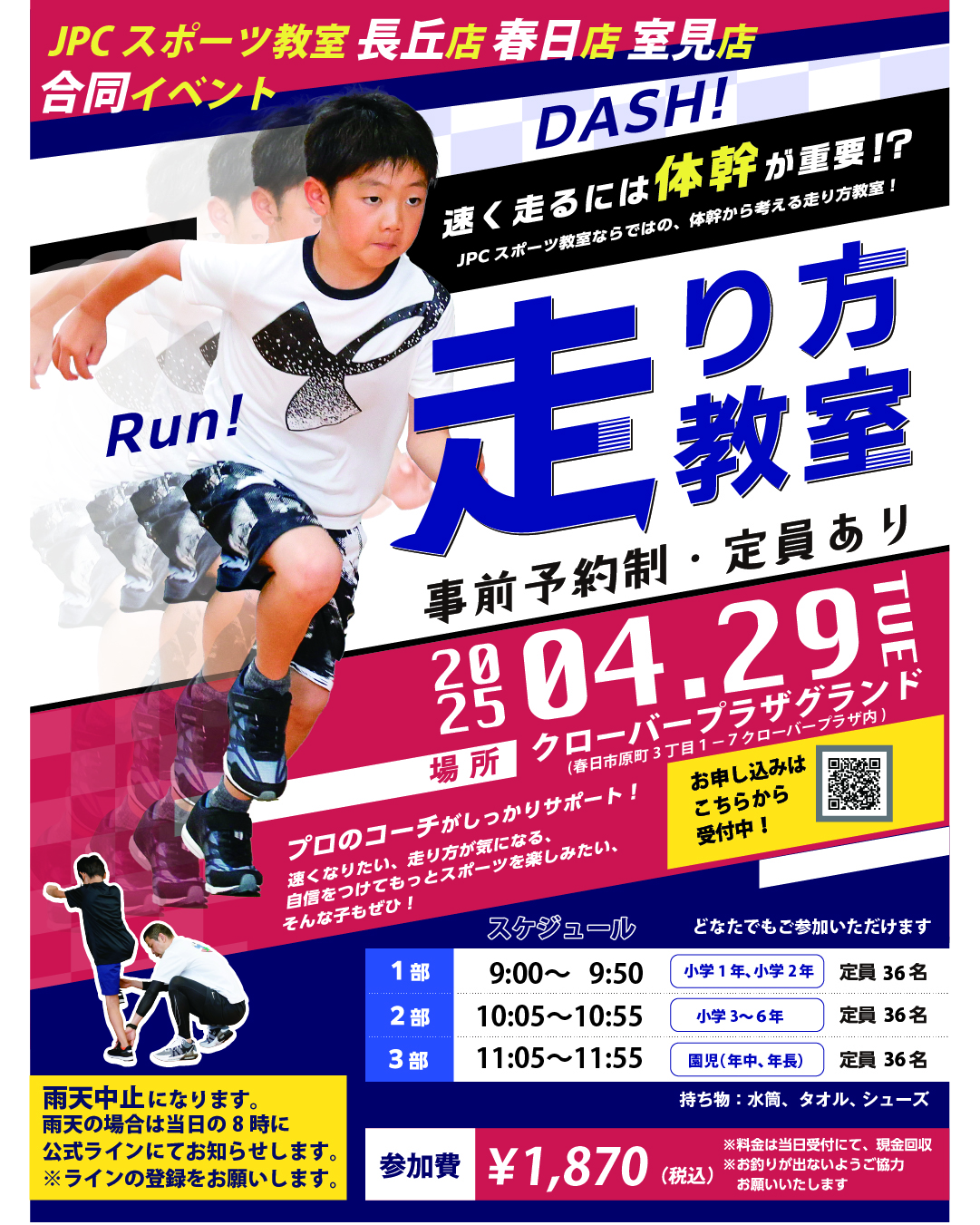 4月29日(火・祝)に走り方教室を開催します! 会 場:クローバープラザグラウンド (春日市原町3-1-7 クローバープラザ内) ※雨天時は中止となります 時 間:〈1部〉9時00分~9時50分(小学...