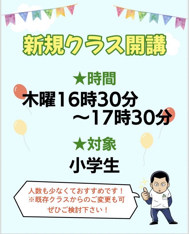 【新規クラス開講のご案内】 この度、新規クラスの開講が決定致しました✨️ 開講日:4月10日(木)から 曜 日:木曜日 時 間:16時30分~17時30分 対 象:小学生 これまで小学1年生までを対象...