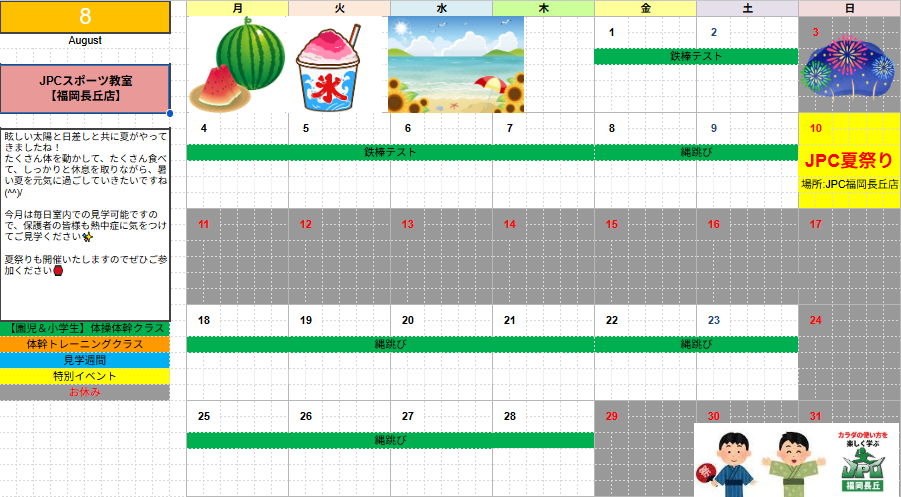 【8月のスケジュール】 8月の体操体幹クラスでは、鉄棒と縄跳びのレッスンを行います! 10日(日)には福岡長丘店にて、春日店・室見店と3店舗合同の夏祭りを行います🎐 体操体幹クラス、体幹トレーニングク...