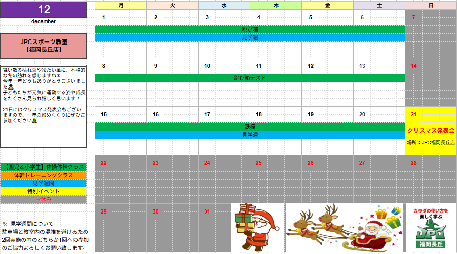 【12月のスケジュール】 12月の体操体幹クラスでは、跳び箱と鉄棒のレッスンを行います! 年内は20日(土)が最終営業日となります。 体操体幹クラス、体幹トレーニングクラスともに、無料体験も受け付けて...