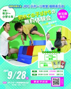 【無料体験会開催のお知らせ】 9月28日(日)に無料体験会を開催致します。 初めての子ばかりで少人数での体験会のため、初めての場所では緊張してしまうお子様にもおすすめです! 日程:9月28日(日) 場所:JPCスポーツ教室福岡長丘店 時間:【1部】9:00〜10:00 【2部】10:30〜11:30 対象:【1部】小学生 【2部】年少さん〜年長さん 定員:各部5名 持ち物:飲み物、タオル ご参加は事前予約制になります。 少人数での体験会のため、ご参加をご希望の方はぜひお早めにお申込みください! お申込はこちら 皆様のご参加をお待ちしております!