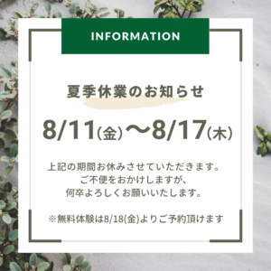 JPCスポーツ教室(TOP) » 福岡長丘店 » お知らせ » 【夏季休業のお知らせ】