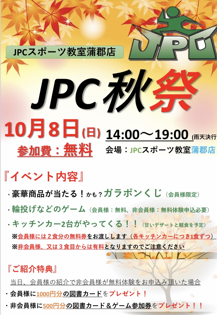 この度、JPCスポーツ教室蒲郡店で秋祭りを開催します🎉 楽しいゲームやイベントを企画しております!そしてお祭りにはキッチンカーがやってきますよ! 皆で一緒に遊んで盛り上がりましょう!   JPCスポー...