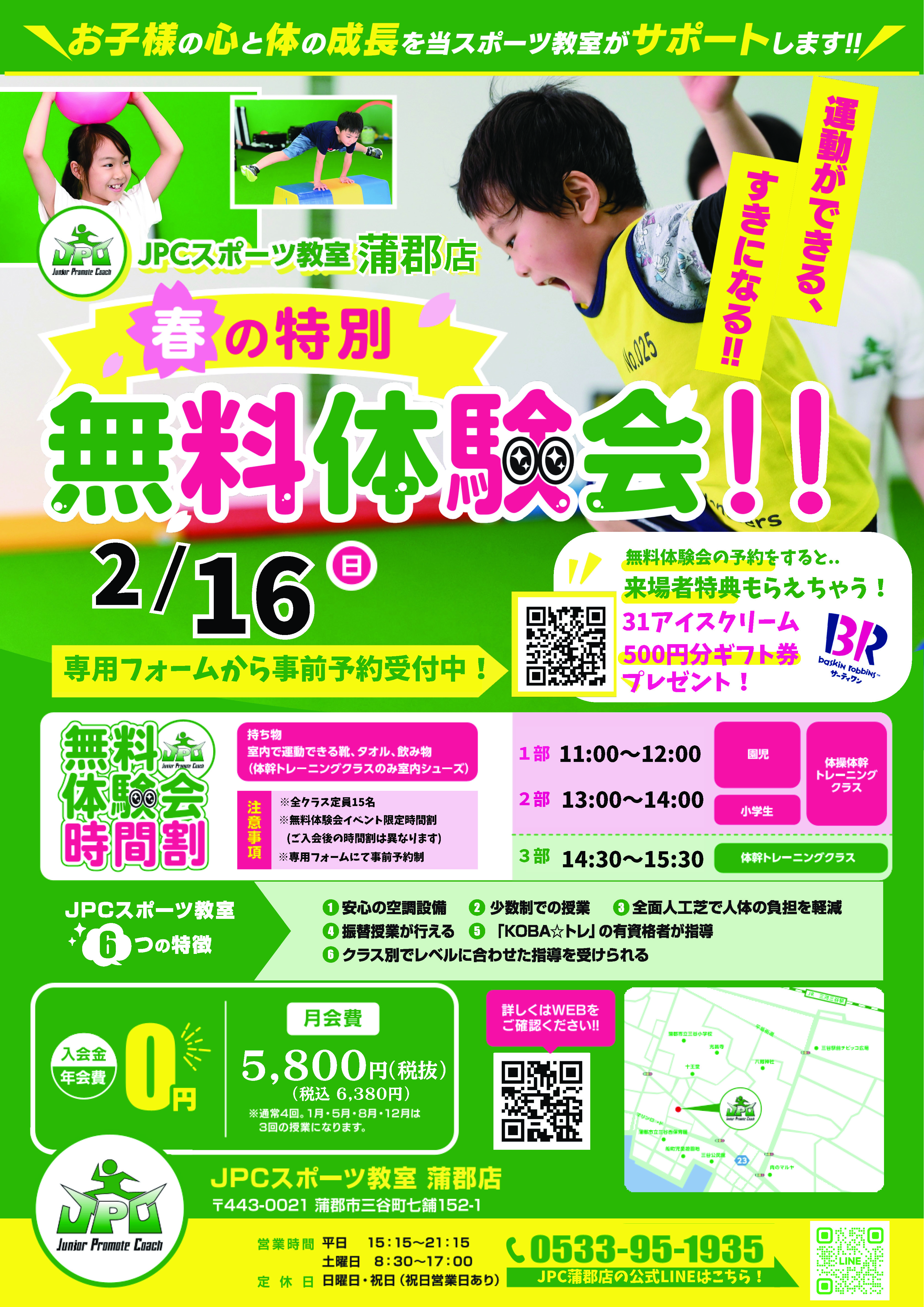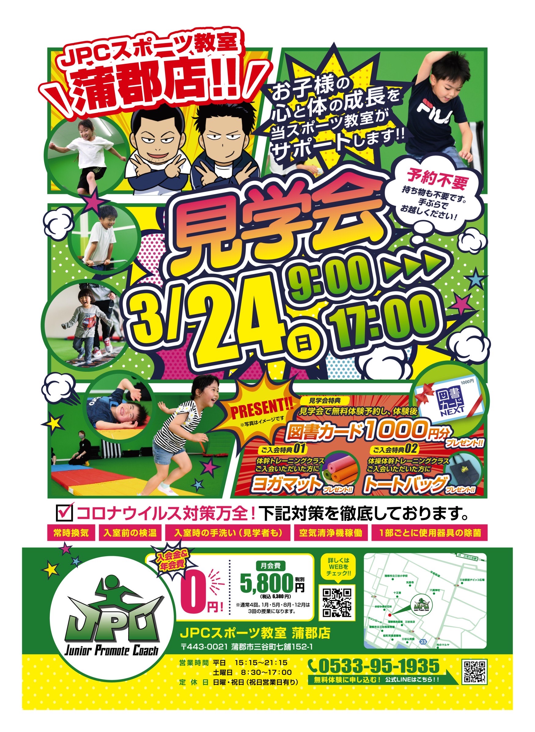 この度、JPCスポーツ教室蒲郡店で見学会を開催します🎉 【見学会開催日時】 日時:3月24日(日)9:00~17:00 場所:蒲郡店(蒲郡市三谷町七舗152ー1) 対象:非会員様 イベント内容:無料体...