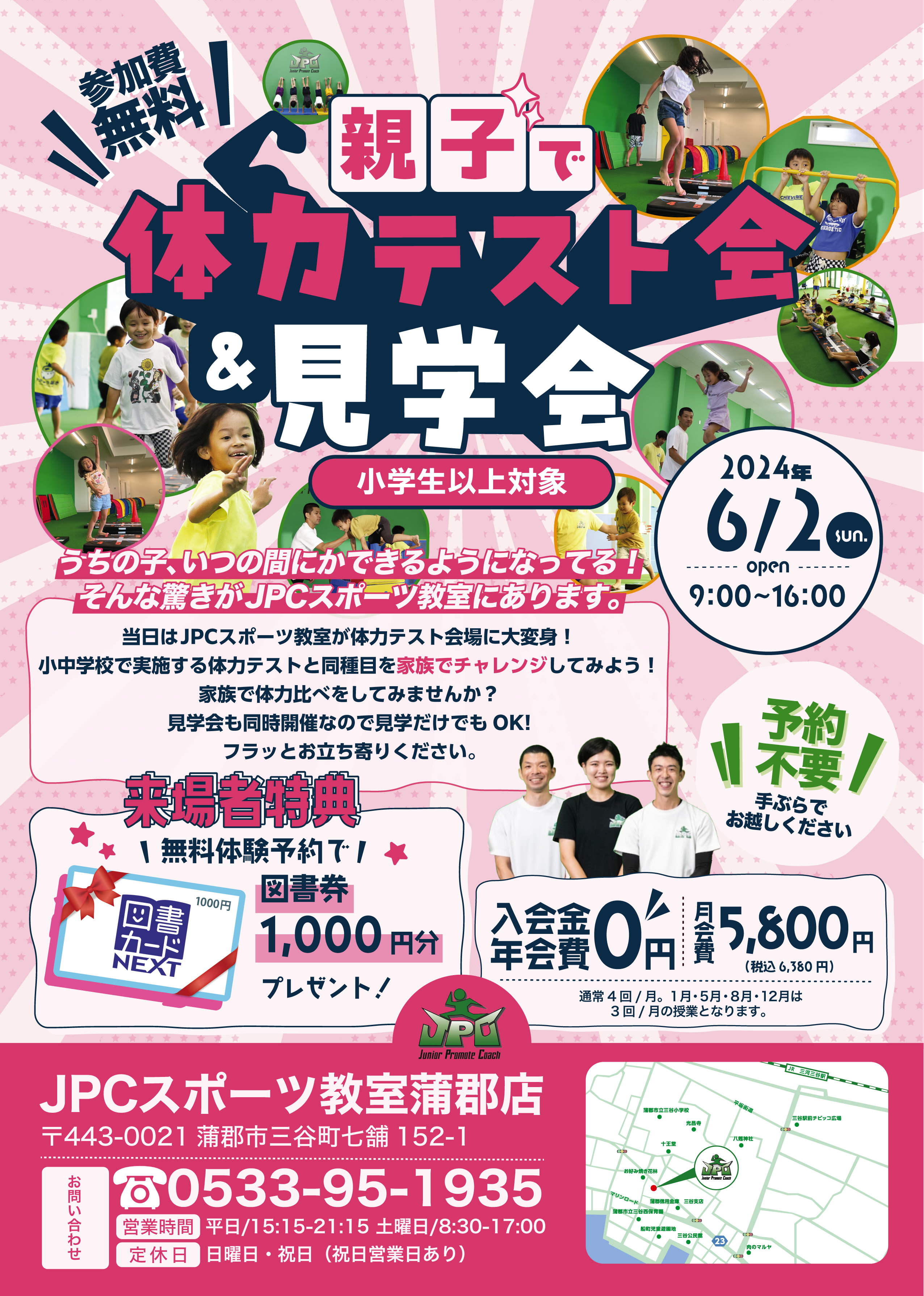 この度、JPCスポーツ教室蒲郡店で親子で体力テスト会&見学会を開催します。 【親子で体力テスト会&見学会】 日時:6月2日(日) 09:00~16:00 場所:JPCスポーツ教室蒲郡店(蒲郡市三谷町七...