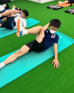 腹斜筋の強化。投げる動作にも、蹴る動作にも必要な部位。