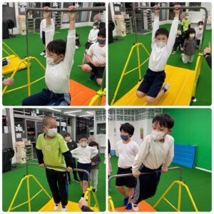 どのくらいの時間、ぶら下がっていられるかを競って力比べ✨