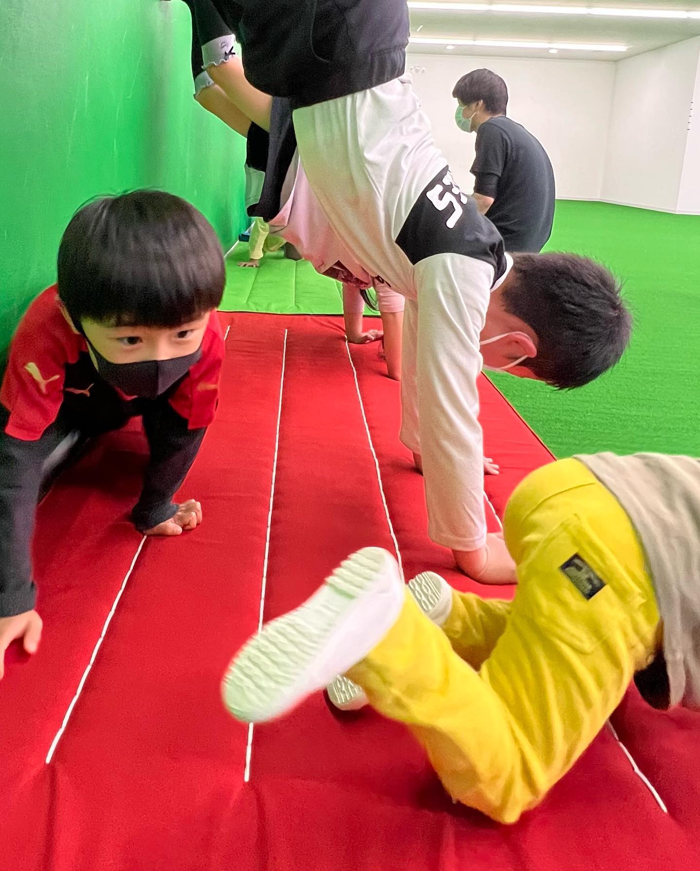 全員がトンネルをくぐる間、 壁倒立でトンネル作り 腕力と同じくらいお腹に力を入れることが大事です! おうちでもできる腕力強化 保護者の方が見ていただいている時に、是非やってみてください! 腰が反らない...