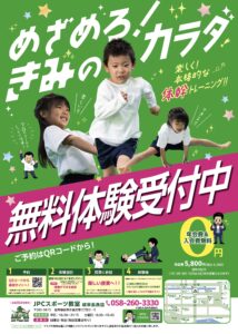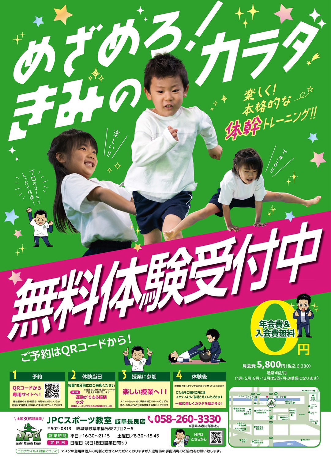 こんにちは! JPCスポーツ教室 岐阜長良店です。 少しずつ気温も上がってきて気持ちの良い季節になってきましたね!   当教室では、無料体験随時受付中です! 特に子供達は、室内外問わず思いっきり身体を...