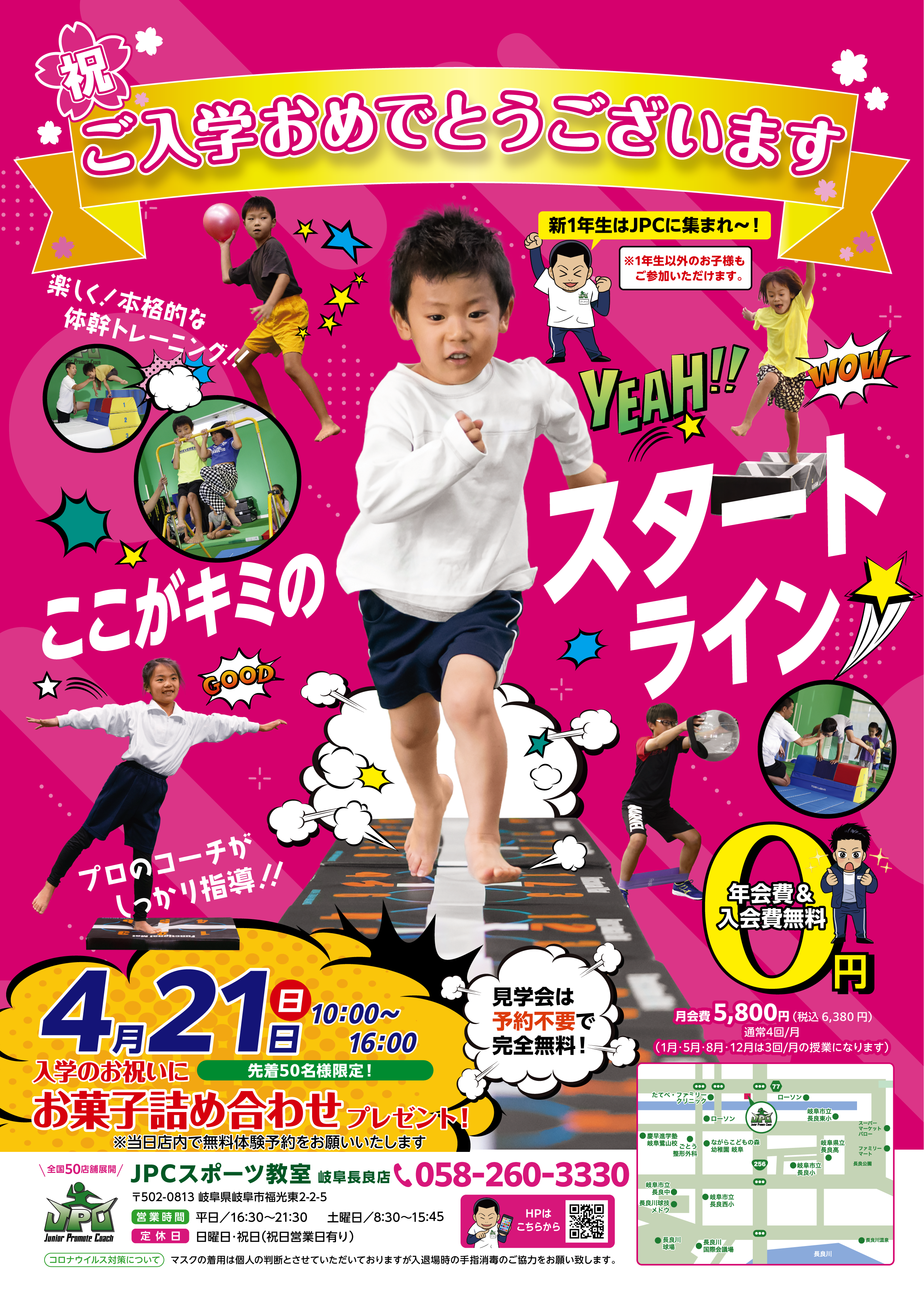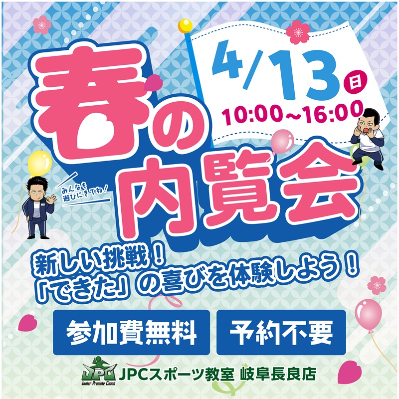 こんにちは! JPCスポーツ教室長良店です。 イベントの開催についてのお知らせです。 🌸春の内覧会🌸 開催日:4月21日(日) 開催時間:10:00~16:00 ご入学、ご入園、進級おめでとうございま...