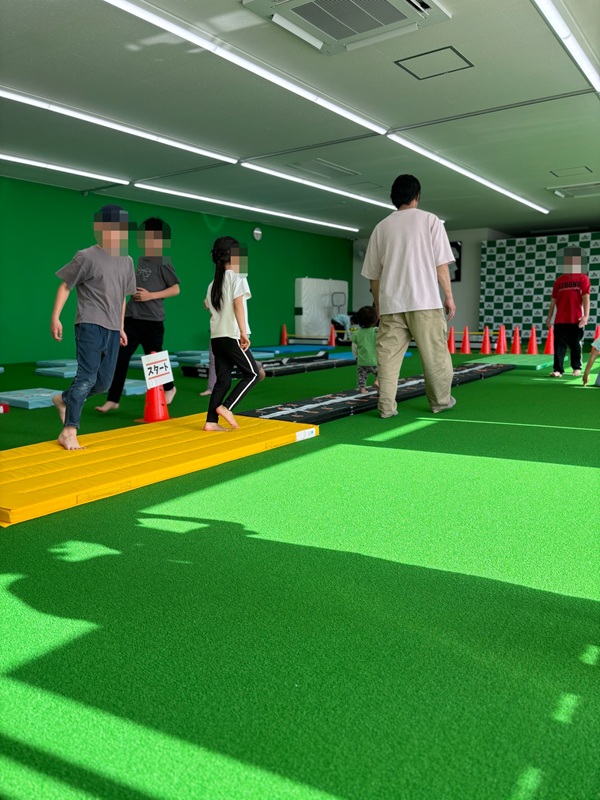 店内の床は全面転んでもいたくない人工芝で安心して運動ができます。