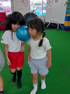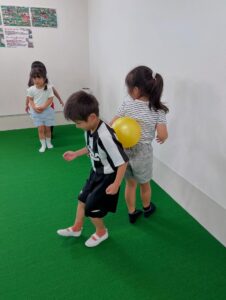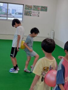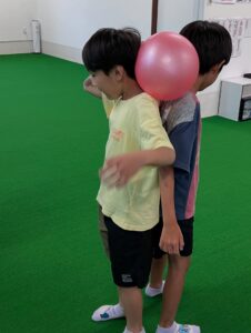 お腹や、背中、ほっぺ、腰でボールを挟みます!
