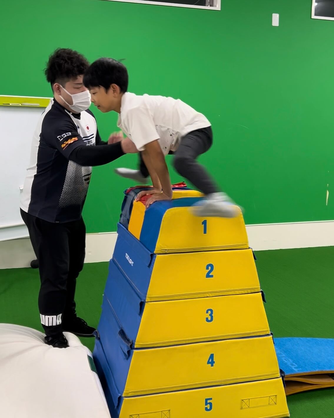 手は、跳び箱の奥につき、さらに身体を通すために手の間を広めにつきます! 手のつく位置を広めにとるように意識しましょう。 右手と左手のそれぞれの置く位置に目標をつけると意識しやすくなります。 跳び箱の奥...