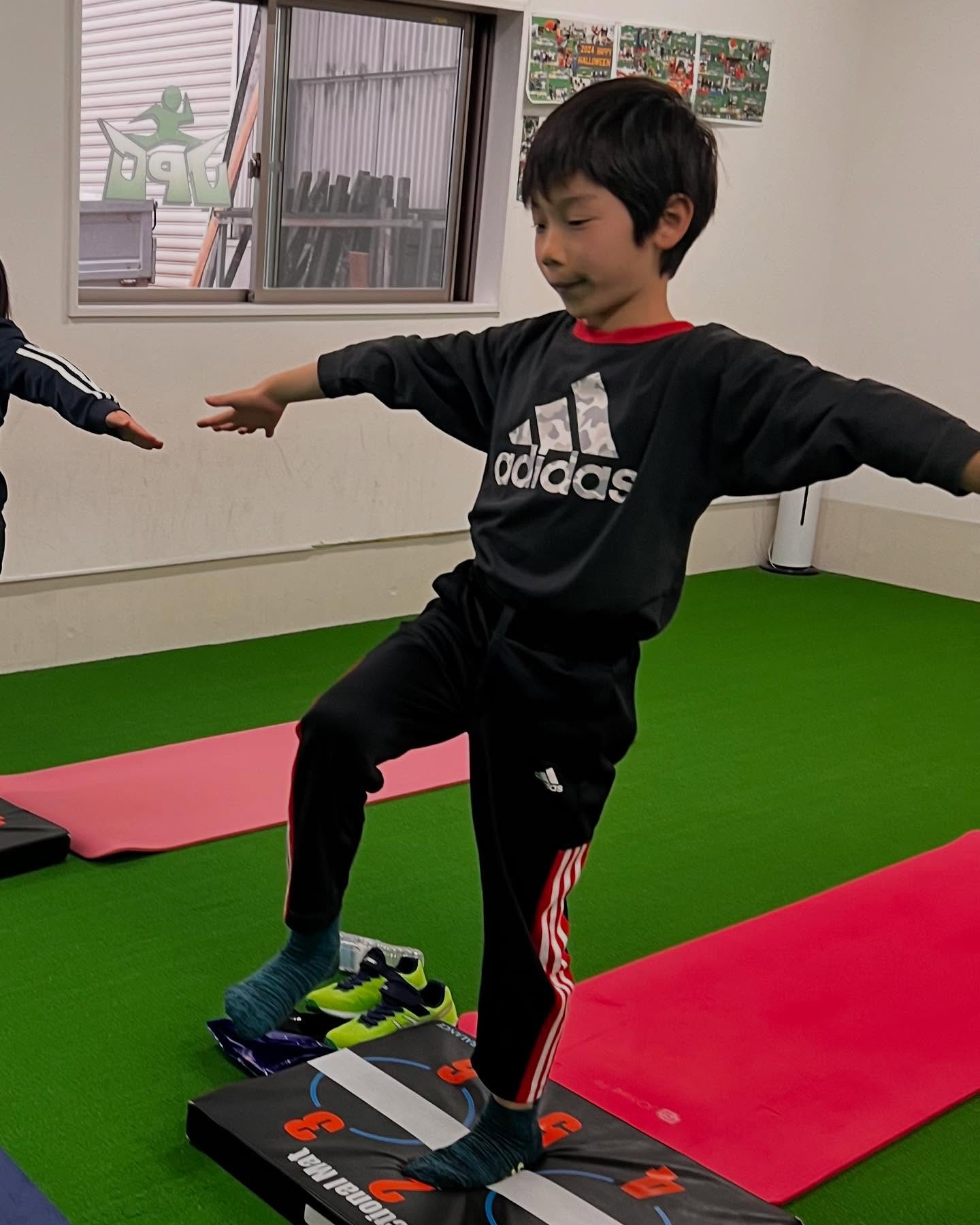 ファンクショナルマットの上で 走ったり、飛び跳ねたり、バランスをとったりして 足裏を刺激し、運動能力UPをはかっています! 写真は、あるクラスの片脚バランス時の かかとの状態です どのかかとが正しく立...