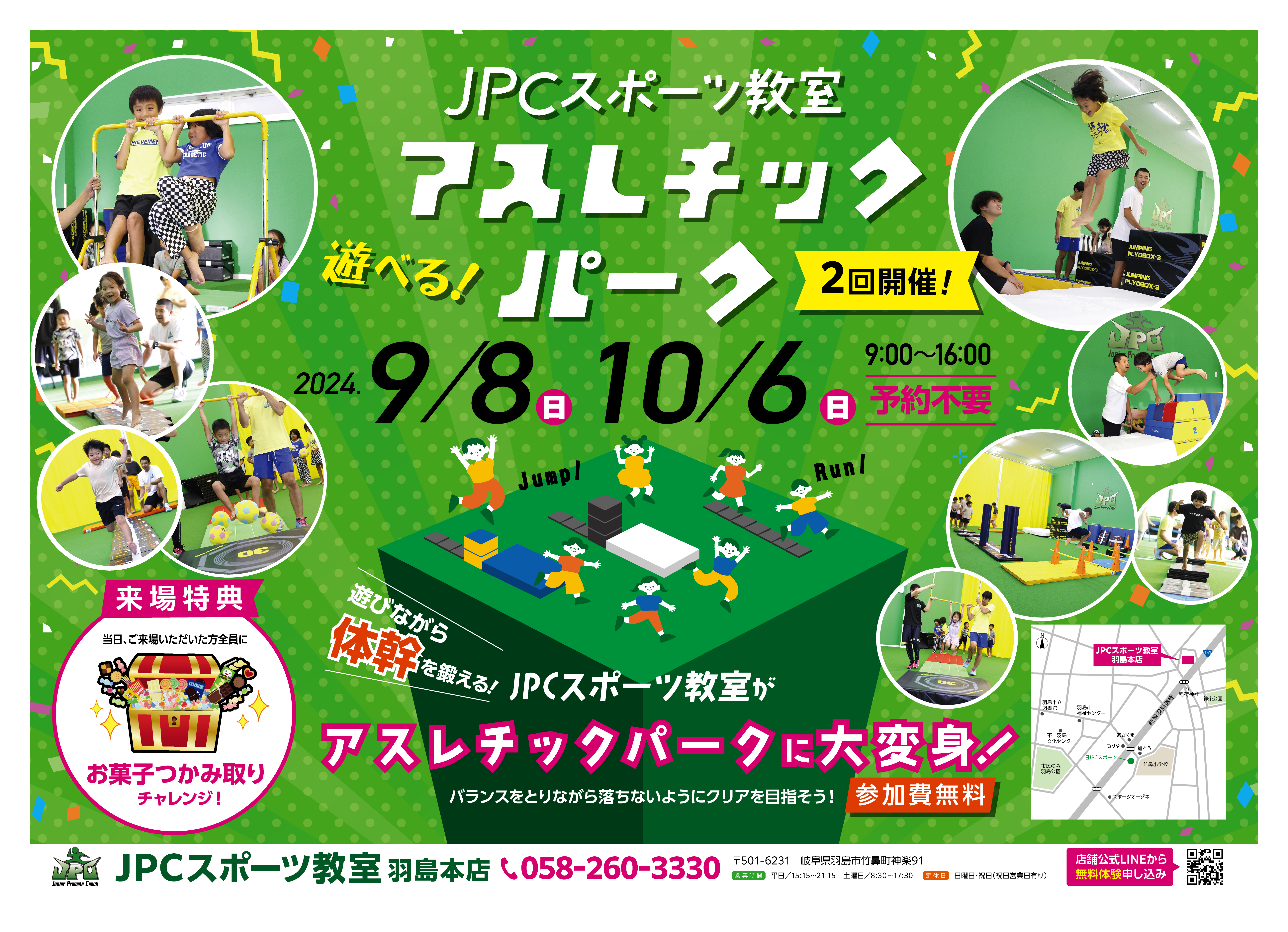 こんにちは! JPCスポーツ教室羽島店の笑顔がかわいいでお馴染みのみずコーチです!(笑) 明日9月8日(日)にJPCスポーツ教室羽島店にてアスレチックパークを開催します! 遊びながら体幹を鍛え、バラン...