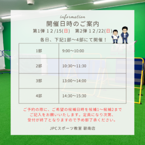 12/15(日)・22(日)9:00~15:30まで各日4つのクラスに分けて開催!