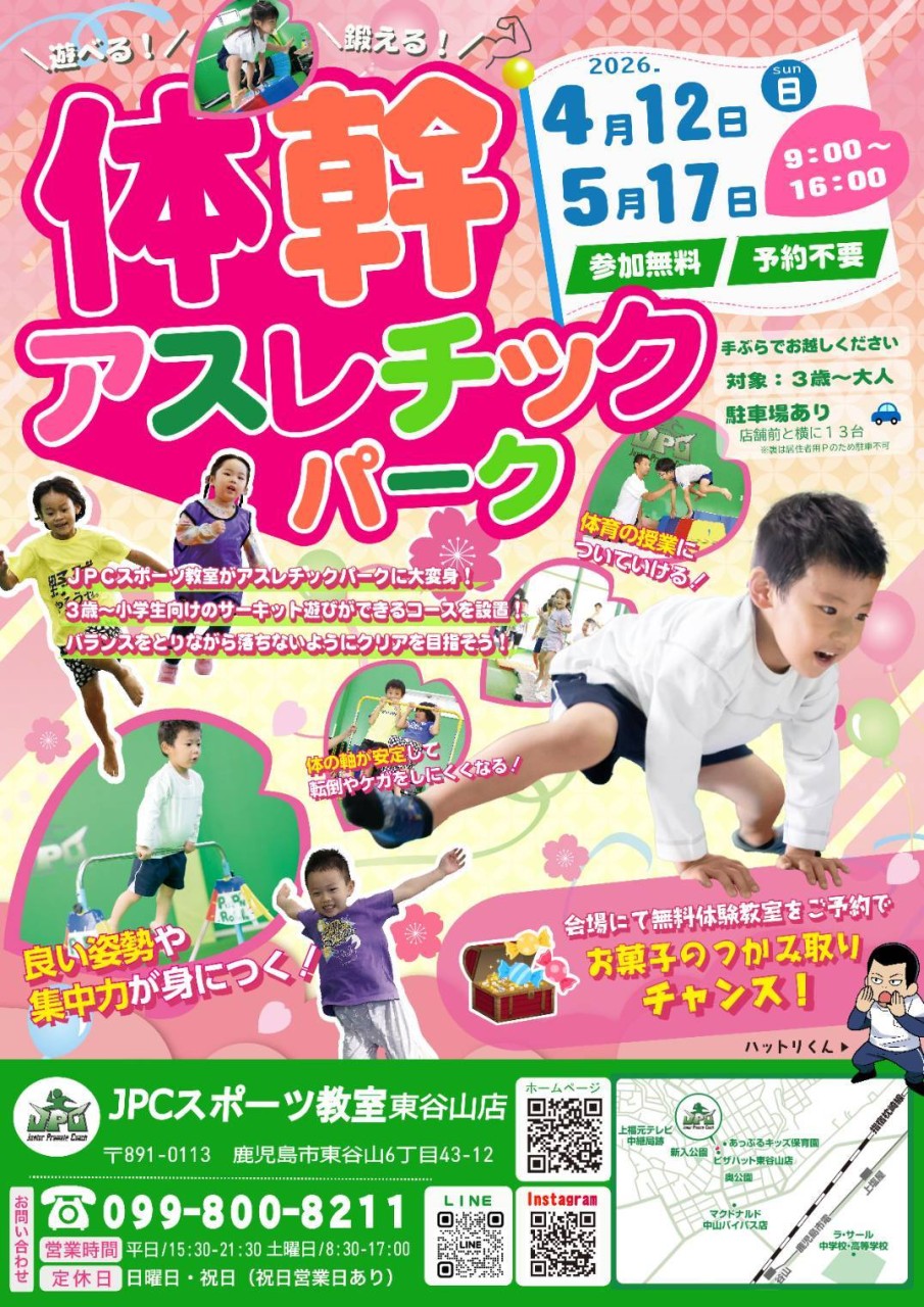 こんにちは、JPCスポーツ教室鹿児島東谷山店です。 昨年大好評をいただいた「体幹アスレチック」イベントが今年も開催決定! 開催日は、 3月22日(日)、4月12日(日)。 参加無料・ご予約不要 でどな...
