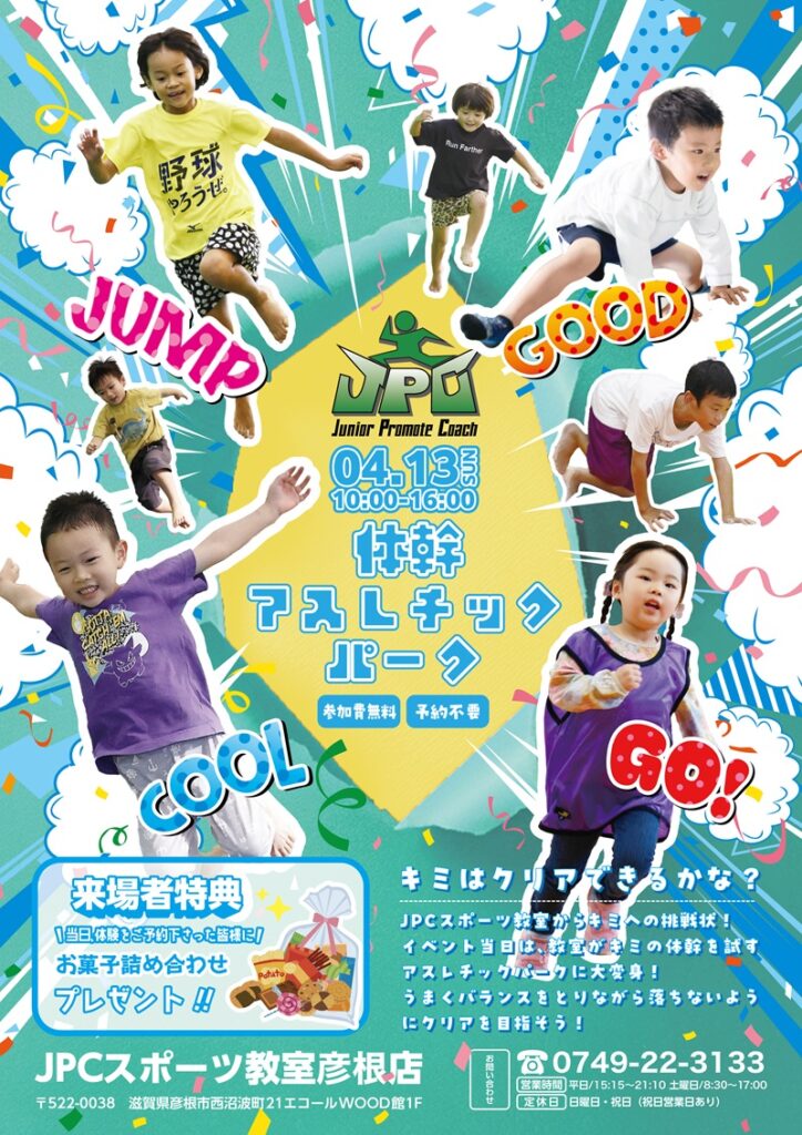 JPCスポーツ教室(TOP) » 彦根店 » ブログ » 4月13日【参加無料・予約不要】体幹アスレチックパーク|全国に約90店舗・約2万人が通うJPCスポーツ教室!