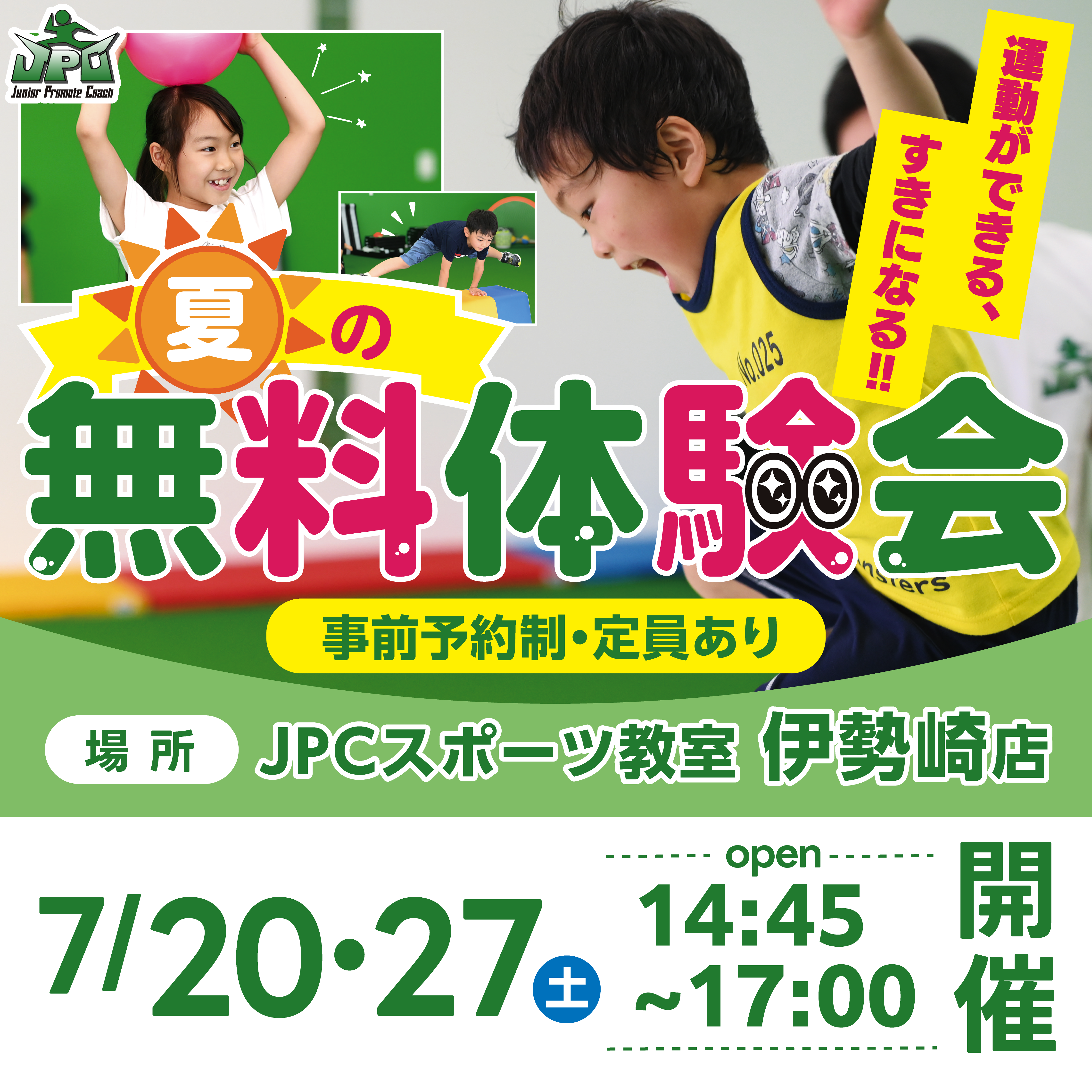こんにちは! JPCスポーツ教室伊勢崎店です!   7月20日・27日(土) ①14:45~ ②16:00~ 無料体験会を開催いたします🙌 ※各クラス定員5名・事前予約制 体験の受付は常に行っておりま...