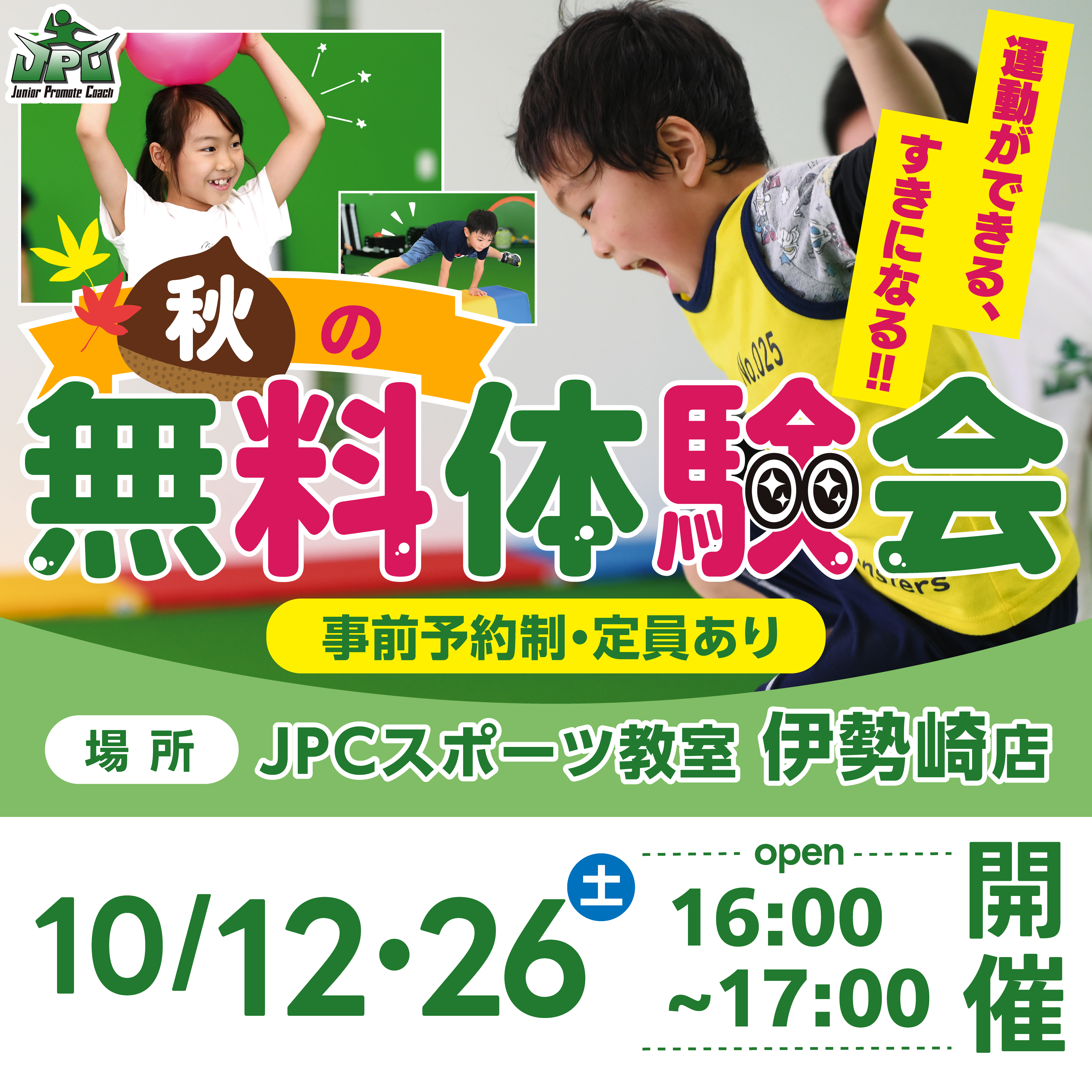 全国に約100店舗・約2万人が通うJPCスポーツ教室伊勢崎店 10月26日【参加無料・要予約】おためし無料体験会開催! 10月26日JPCスポーツ教室伊勢崎店【おためし無料体験会開催】 おためし無料体...