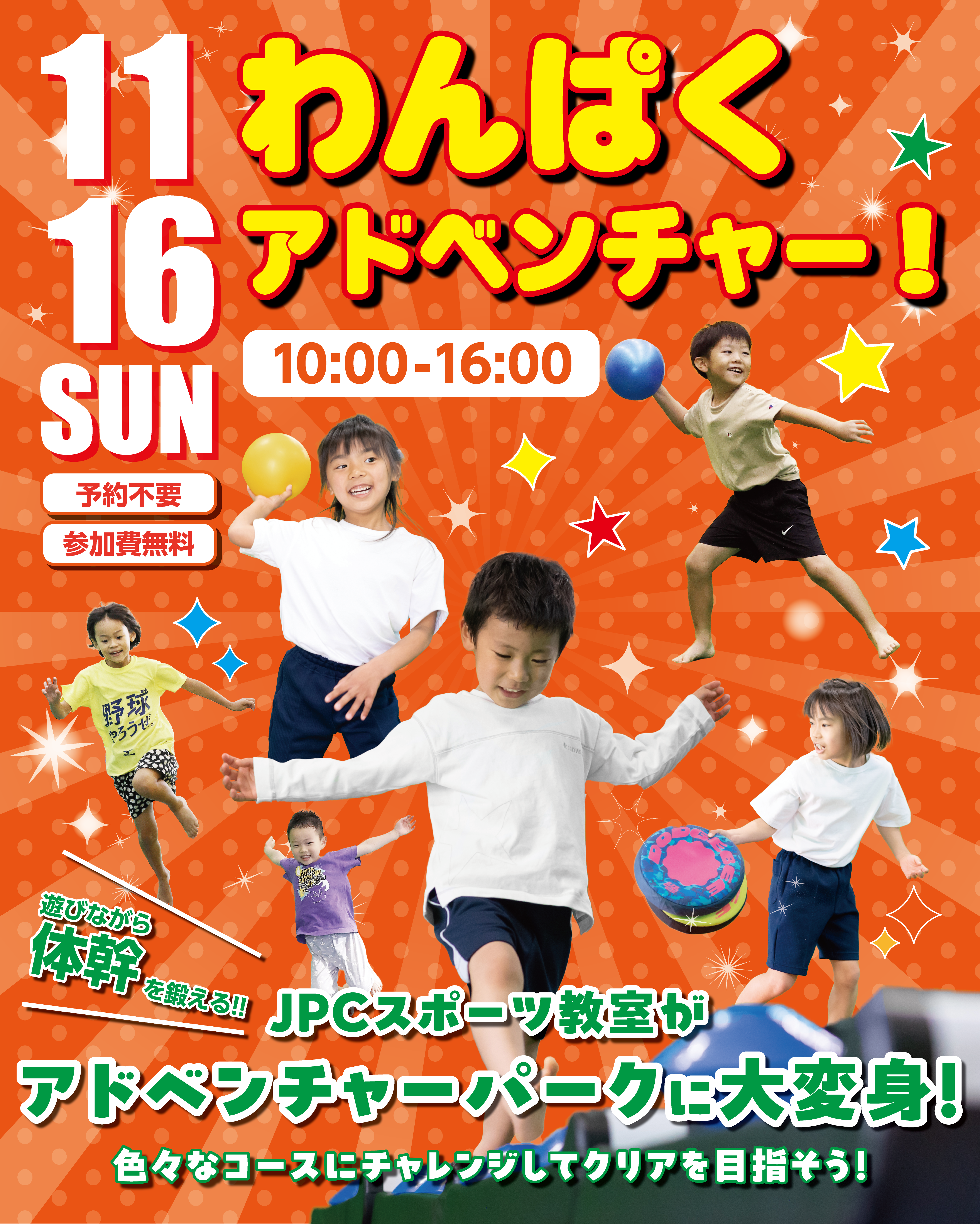 全国に100店舗以上!・約2万人が通うJPCスポーツ教室伊勢崎店 11月16日【参加無料・予約不要】わんぱくアドベンチャーイベント開催! 11月16日JPCスポーツ教室伊勢崎店【わんぱくアドベンチャー...