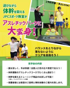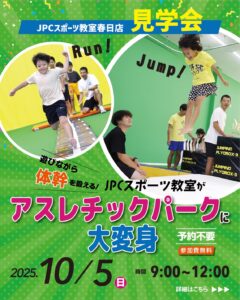 体幹アスレチックパーク&見学会 開催日:10月5日(日) 開催時間:【午前の部】9:00~12:00 ※遊びのお時間はお一人様30分程度となります。 ※非会員様向けのイベントです。 ご来場頂きまして、通常授業の体験予約をされた方にはお菓子の詰め合わせをプレゼント致します🍪 当日は春日店が体幹アスレチックパークに大変身! 体幹トレーニングの有資格者のトレーナーがスポーツの楽しさを伝えます! 見学だけでもOK!運動のお悩みを相談するのもOK! 是非お越しください♪ 近くに住んでるけどどんな教室なのかな❓ うちの子運動苦手なのよね❓ スポーツに体幹は必要って言うけど体幹って…❓ などなど、気になることがあれば是非イベントでお待ちしております! ◎運動が苦手なお子様 ◎猫背や走るフォームが気になるお子様 ◎体の使い方を学びたいお子様 →JPCで体操を習いませんか?😊 ◎部活やクラブチームでの成績を上げたいお子様 ◎ライバルに差をつけたいお子様 ◎怪我をしにくい身体を作りたいお子様 →JPCで体幹トレーニングをしませんか?🔥 当日のご予約は不要でございます。 お近くにいらっしゃる際にお気軽にお立ち寄り下さい😊 イベントまで待てないという方には 通常のレッスンでの無料体験も可能です👍 通常クラスには定員がございますのでご希望の日付の体験ご予約はぜひお早めに✨