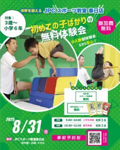 はじめてのお友達と少人数で行うので、人見知りのお子様も安心してご体験できます😊 また、普段のレッスンと同じ流れで行うので通った時のイメージもつきやすいです✨ 日程:8月31日(日) 場所:JPCスポーツ教室春日店 時間:〈体操体幹クラス〉 【小学生】9:00〜10:00 【園児】10:30〜11:30 定員:各5名 持ち物:飲み物、タオル 🌟体操・体幹クラス 対象:3歳〜小学6年生 体幹を鍛えて体の使い方を学んで運動が好きになる! 運動を通して成功体験を積むことで自分に自信がつく! 諦めずに何事にもチャレンジする前向きな心を育てます! ご予約は下記のURLよりお申込み頂けます!