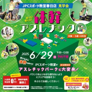 体幹アスレチックパーク&見学会 開催日:6月29日(日) 開催時間:9:00~13:00 ※遊びのお時間はお一人様30分程度となります。 ※非会員様向けのイベントです。 ご来場頂きまして、通常授業の体験予約をされた方にはお菓子の詰め合わせをプレゼント致します🍪 当日は春日店が体幹アスレチックパークに大変身! 体幹トレーニングの有資格者のトレーナーがスポーツの楽しさを伝えます! 見学だけでもOK!運動のお悩みを相談するのもOK!
