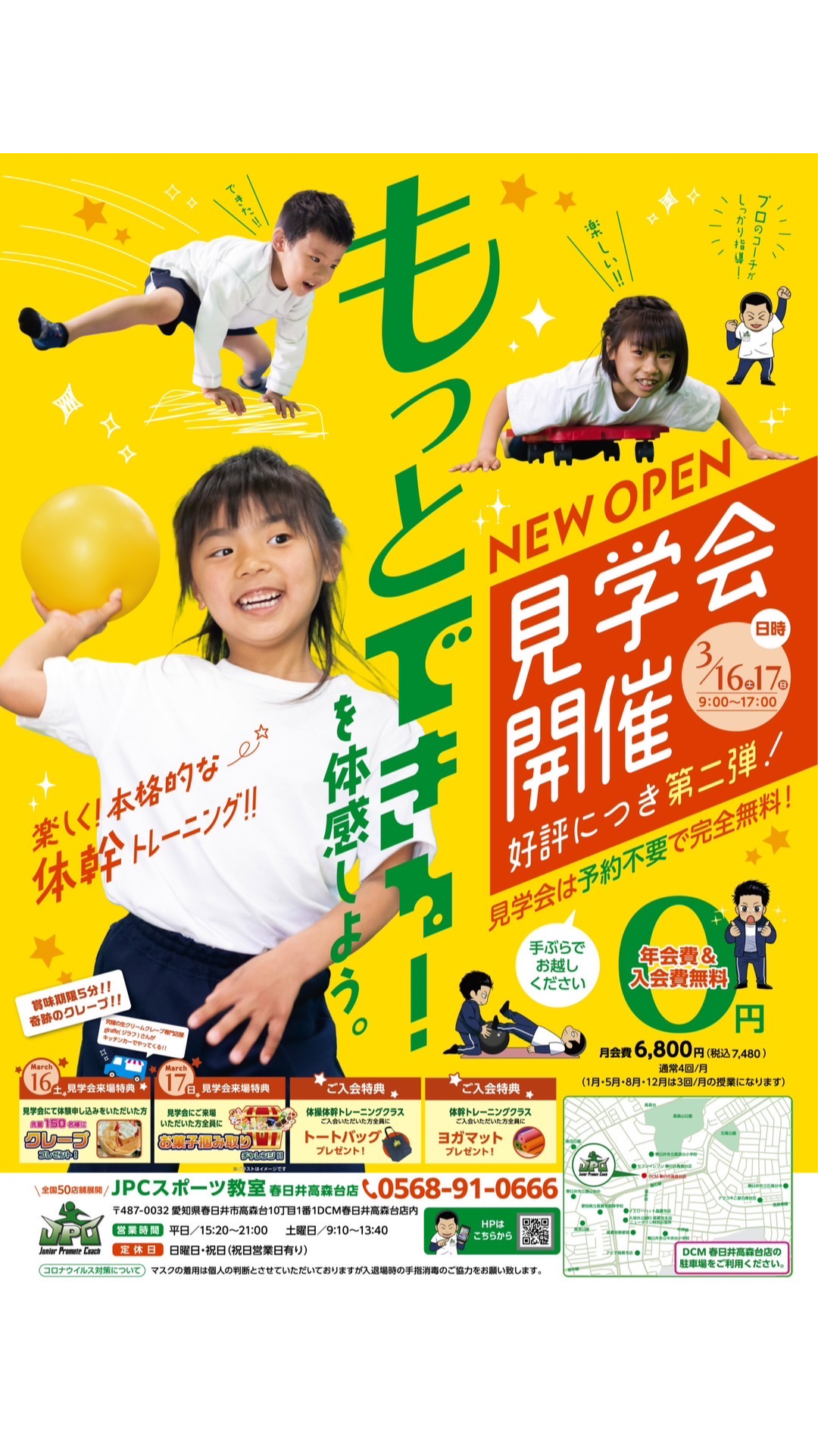 JPCスポーツ教室春日井高森台店です‼️✨ 前回の見学会はたくさんのご来場ありがとうございました😍 次回の見学会のお知らせ📢 🟢3月16日(土)17日(日) 🟢9:00〜17:00 🟢JPCスポーツ教...