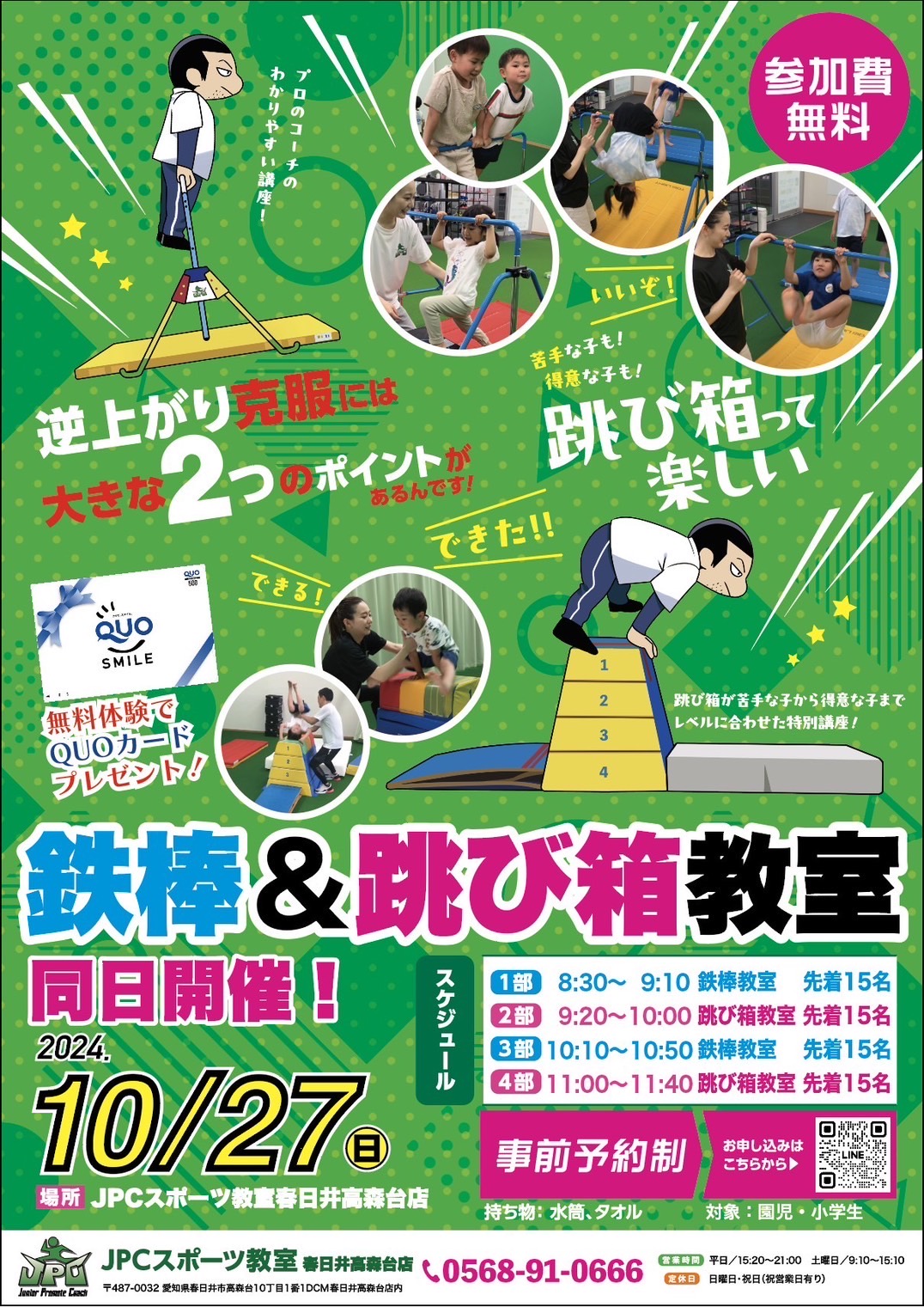 11月16日(日)にJPCスポーツ教室春日井高森台店で 【非会員さま向け 鉄棒&跳び箱教室】を開催します! 45分の授業で、プロのコーチがコツをしっかり教えます。 また、別日の無料体験ご参加でQUOカ...