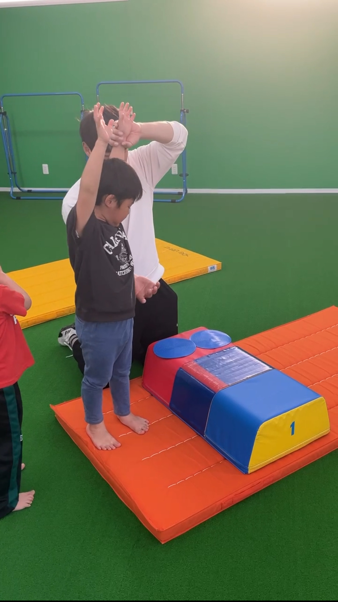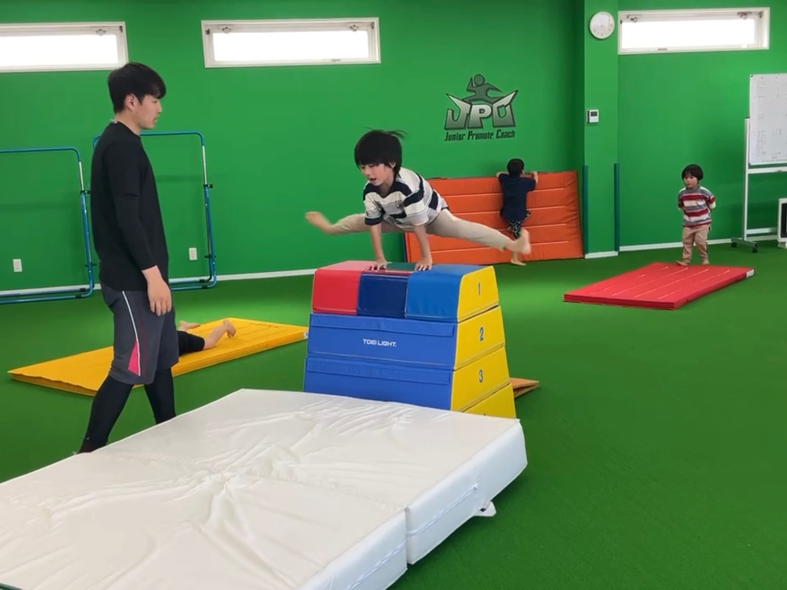 写真の跳び箱は5段に挑戦しているところです。なんとこの5段、学校の跳び箱の8段に相当します!