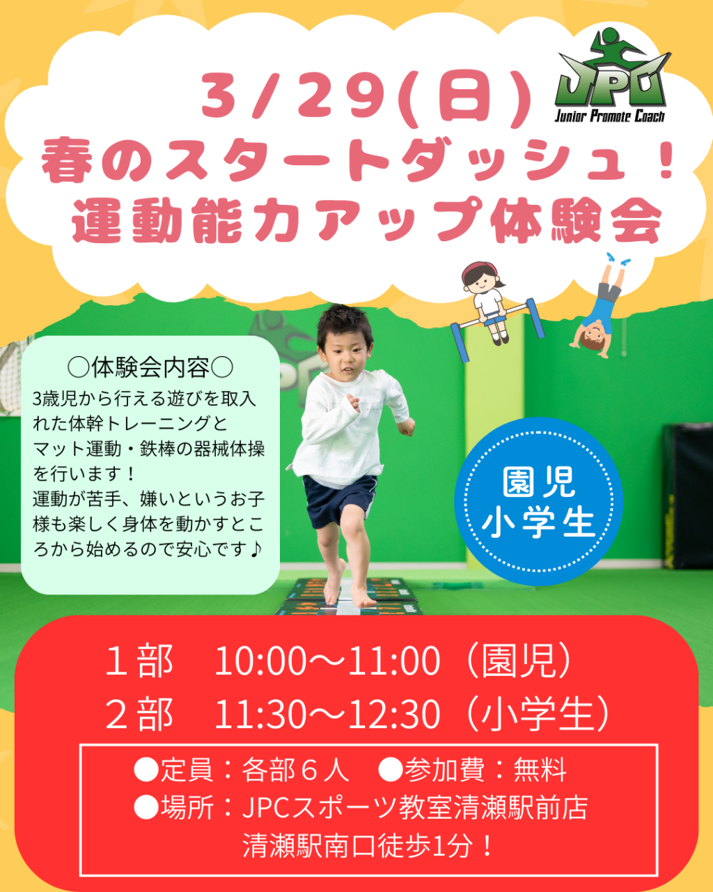 3月29日(日)に、園児・小学生向けの 「運動能力アップ体験会」を開催いたします! 本体験会では、3歳から行える遊びを取り入れたトレーニングを中心に、 体幹トレーニング・マット運動・鉄棒などを通して、...