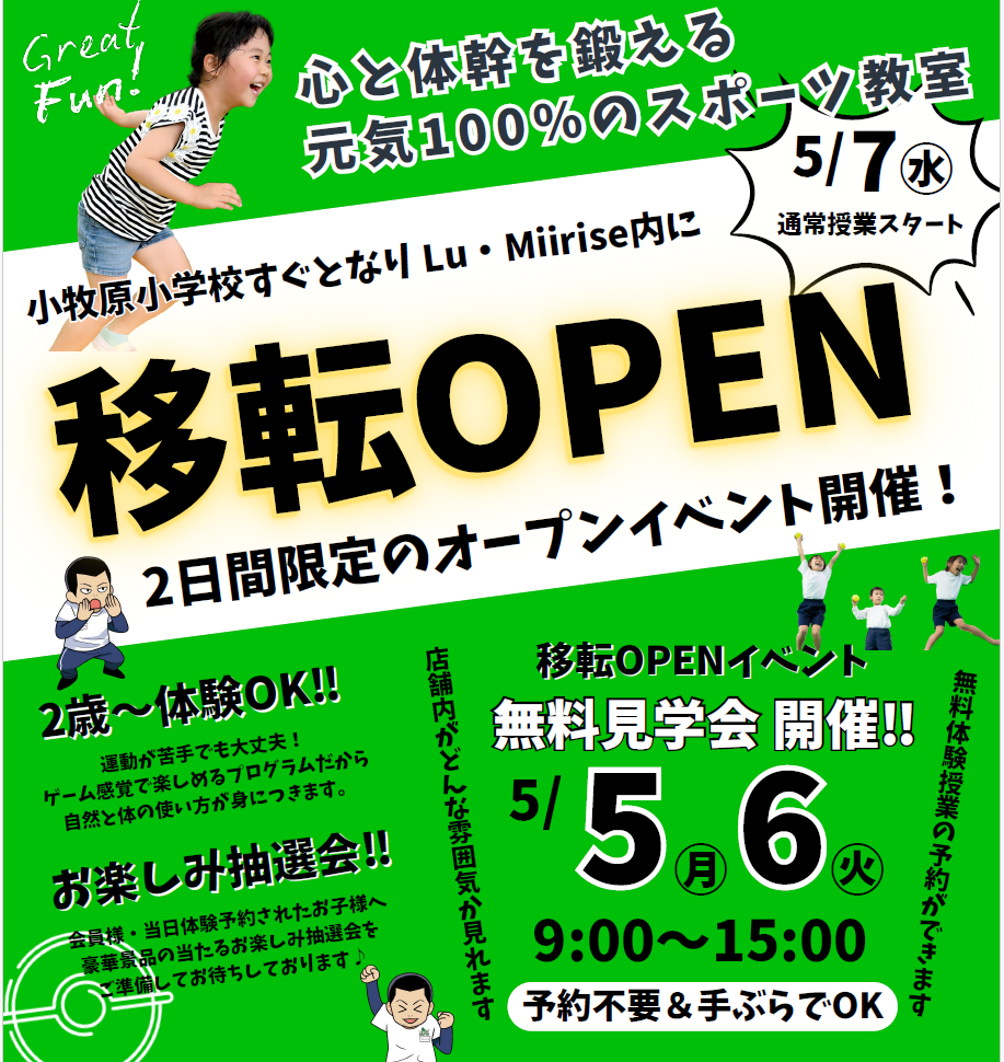 JPCスポーツ教室小牧中央店は5月7日より移転地にて新しく授業がスタートします!! それに伴い5月5日(月)・6日(火)にOPENイベントを開催します♪ 会員様も非会員様もみんなが楽しめるイベントにな...