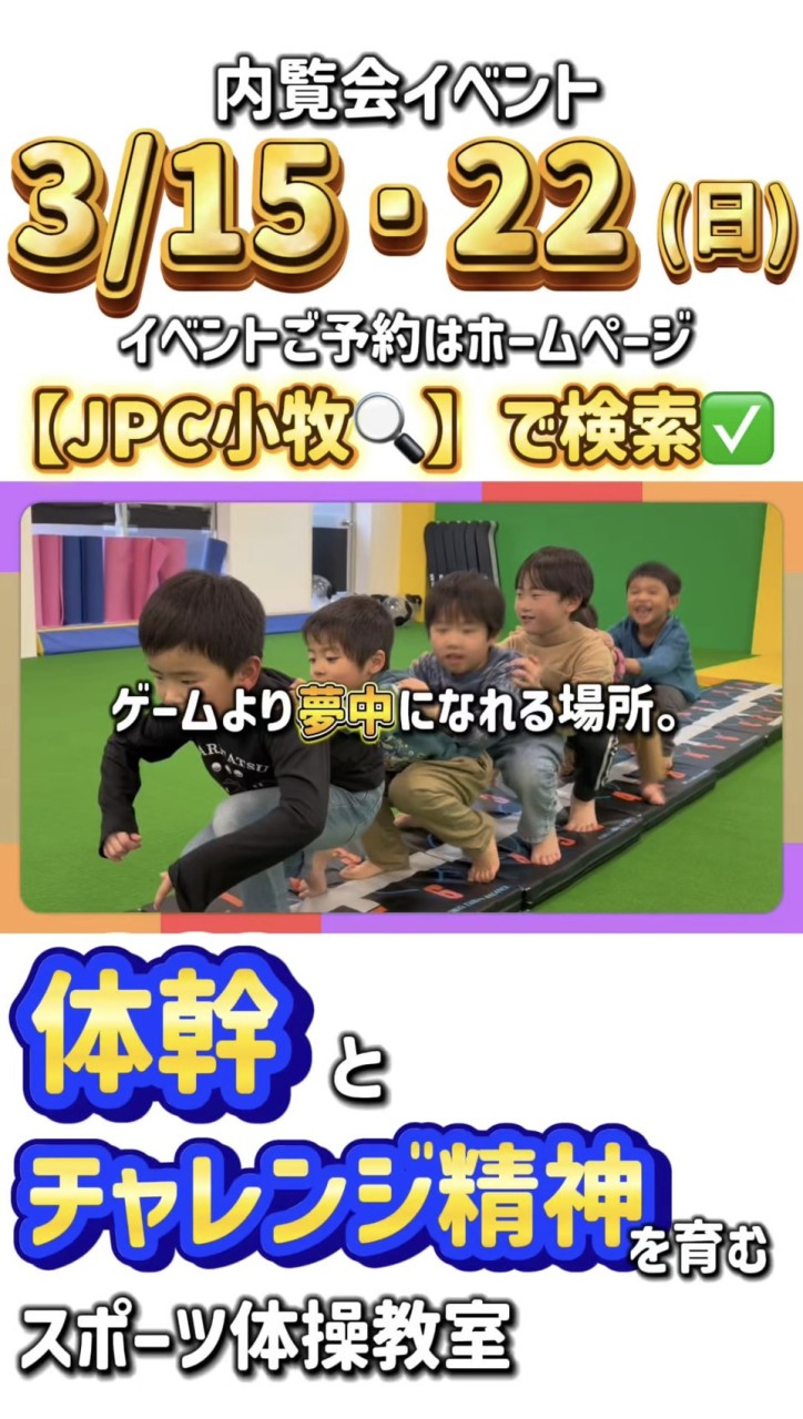 3/15.3/22 (日)に内覧会イベントを行います‼️また3/31までのご入会でトートバックをプレゼント🎁10:00〜15:00でたっくさん遊べるコースを作ります✨年少さん〜小学6年生までが対象とな...
