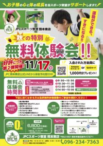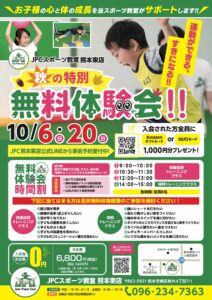🍁秋の特別無料体験会🍁 のご案内です! ① 10月6日(日)②10月20日(日) 日曜日の特別授業です! 参加者は皆様、初めてのJPC スポーツ教室の体験です! 気にはなっていたけど、既存会員さん多い...