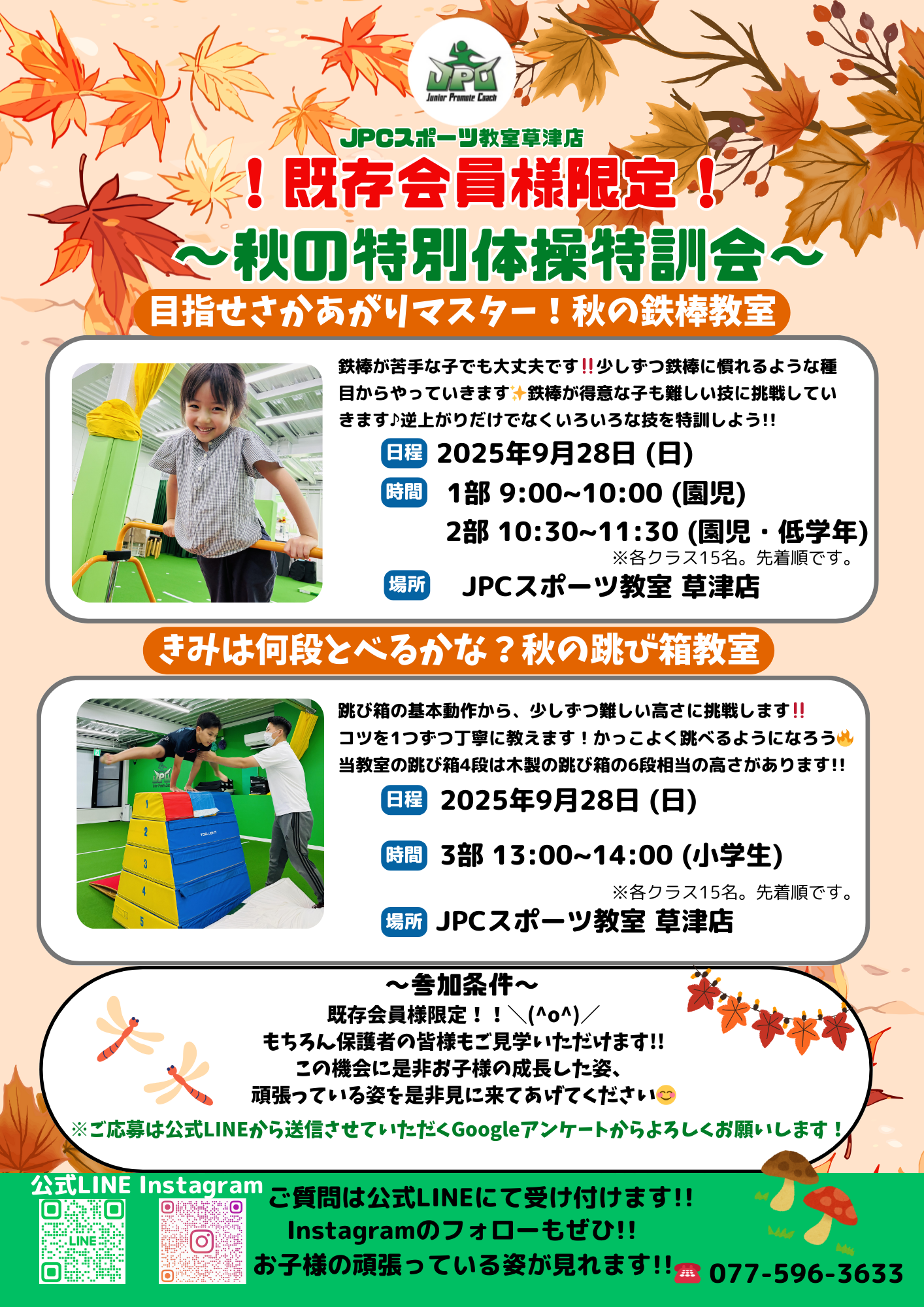 いつも大変お世話になります‼️ もう9月に入り、秋の涼しさが待ち遠しいですね😌🍂 前回8月に行った特別体操特訓会イベントが大好評だったため、なんと今回は【会員様限定】で秋の特別特訓会を行います😆✨ 🌰...